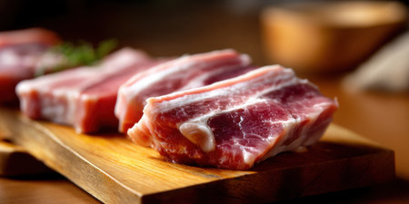 Raw pork belly slices on wooden cutting board with warm lighting creating fresh and appetizing look