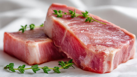 This close-up image showcases two fresh raw pork chops garnished with thyme on a white fabric background, perfect for food photography and culinary presentations.