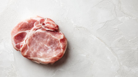 A raw pork chop rests on a smooth white marble surface, ideal for culinary projects, recipe ideas, and food photography that showcases raw meat preparation.