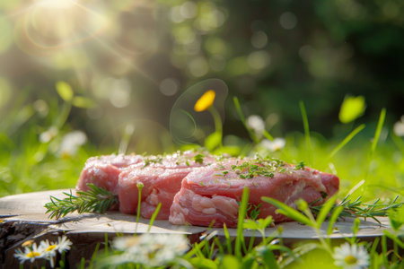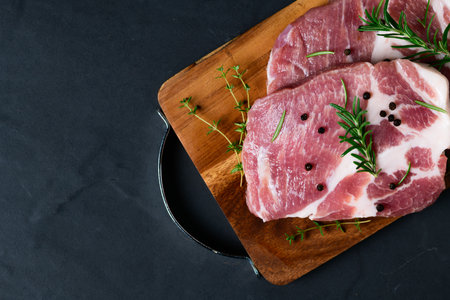 Photo of raw meat. Pork neck with herbs