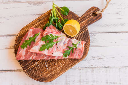 Raw pork meat chops on a wooden board. Top view. Preparation for cooking