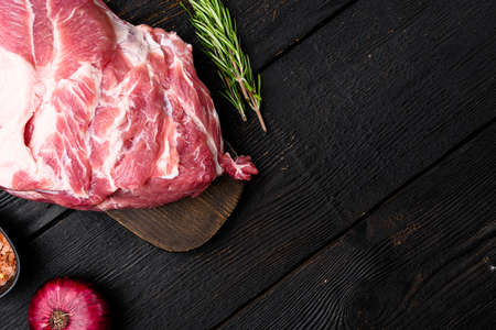 Pork meat raw neck set, with ingredients and herbs, on black wooden table background, top view flat lay, with copy space for text