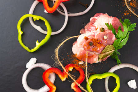 Top view of the meat to which the bay leaf and parsley are tied, the bell pepper is cut into rings. Black background