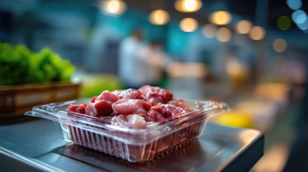 A close-up view of fresh raw meat in a clear plastic container, showcased in a vibrant specialty food market, emphasizing quality and freshness.
