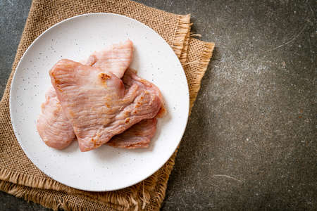 Uncooked tenderized boneless slices of pork loin for chops preparation on the dish on the rustic table