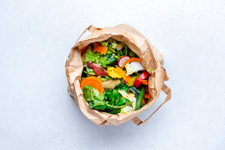 Sorted kitchen food waste in paper eco friendly bag recyclable for garden compost. Sustainable life style, plastic free. Vegetable and fruit peels, scraps from meal preparation