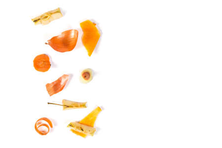 Kitchen waste flat lay of fruits and vegetables peels on a white background with copy space.