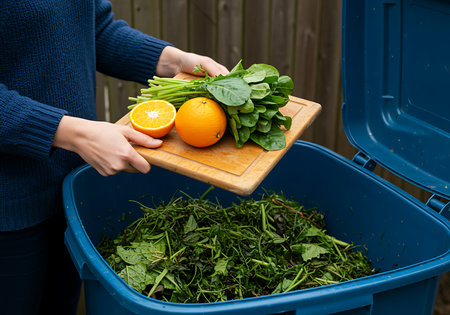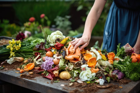 Woman Composting Food Waste, Promoting Ecofriendly Gardening. Concept Zero Waste Lifestyle, Sustainable Living Tips, Green Home Remedies, Eco-Friendly Fashion, Renewable Energy Solutions.