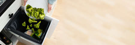 Compost the kitchen waste, recycling at home. Woman cleaning sweet potato and putting vegetables cutted leftovers into the garbage, compost bin on her kitchen. Environmentally responsible, ecology
