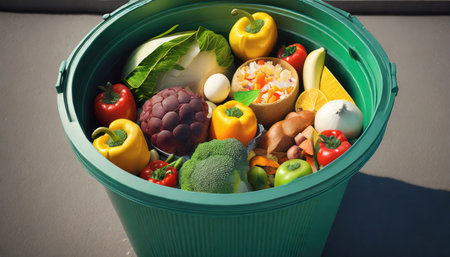 This image captures a colorful variety of fresh vegetables and fruits discarded in a green waste bin, highlighting issues surrounding food waste and sustainability.