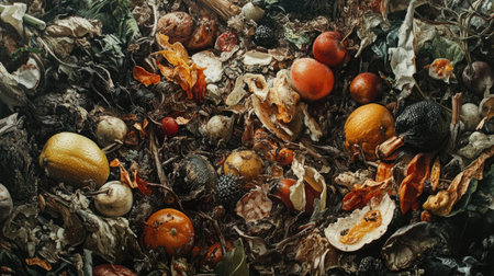 This image captures a stunning arrangement of fresh and decaying fruits and vegetables, set against a textured earthy background. It evokes the natural cycle of life and death, featuring vibrant colors and intricate details that bring the beauty of organic matter to life.