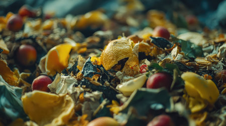 A detailed close-up of a rich compost pile featuring an array of colorful fruit and vegetable scraps amidst dried leaves and vibrant peels.