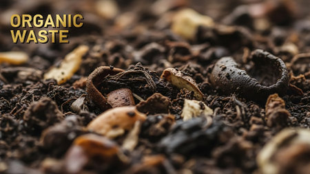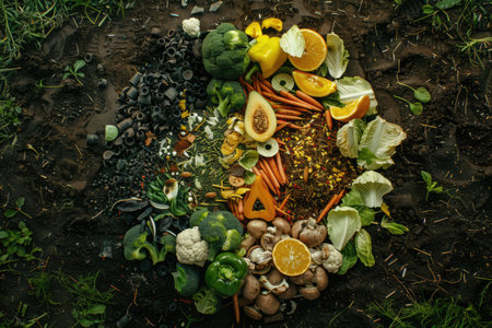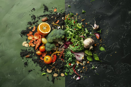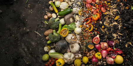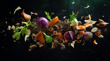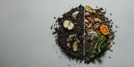 Generative AI, half of food waste compost and half of soil, environmental background, biodegradable kitchen waste, composting organic food