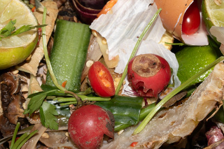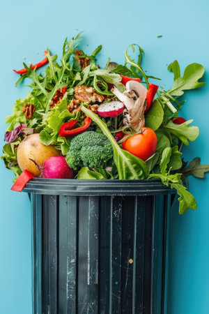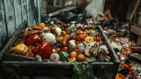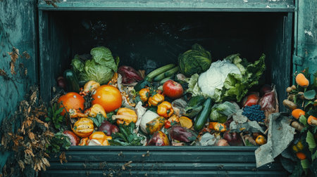 A close-up view of various discarded vegetables and fruits in a waste bin, highlighting the issue of food waste and environmental challenges.