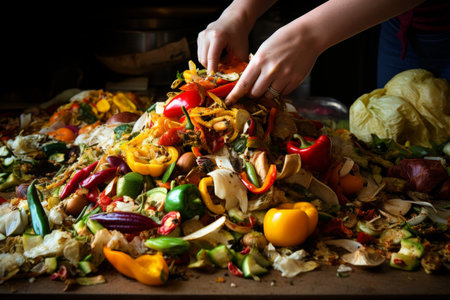 Fresh vegetable scraps mix with soil in a compost pile, creating a vibrant heap. The composting process aids in recycling organic waste into nutrient-rich soil for gardening.