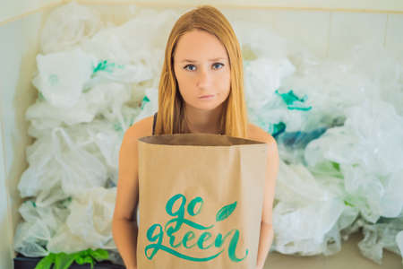 Woman holding a package with the inscription GO GREEN amid a pile of plastic bags. Zero waste concept. The concept of World Environment Day