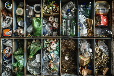 Drawer filled with plastic bottles and assorted items neatly sorted and organized, Depict the cycle of waste being collected, sorted, and repurposed