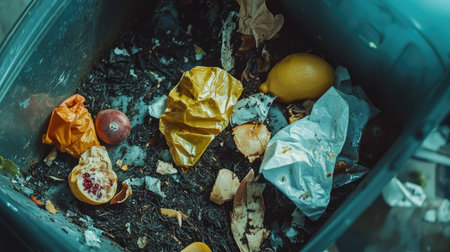 A detailed shot of a biodegradable bag inside a trash can, filled with organic waste like potato skins and avocado pits.