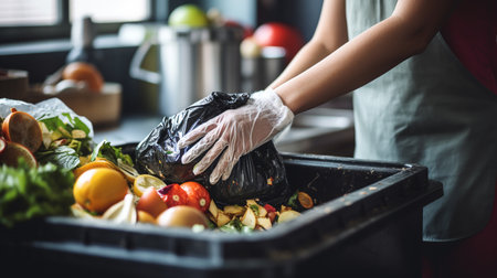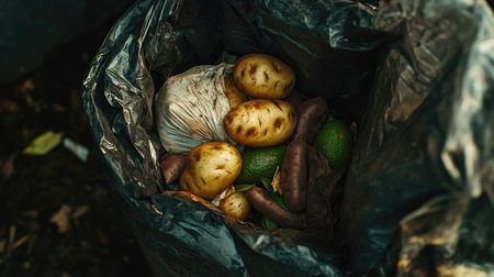Photo of rotten vegetables in trash illustrating food waste and disposal at home. Concept Food waste, Kitchen trash, Rotten vegetables, Home disposal, Environmental impact