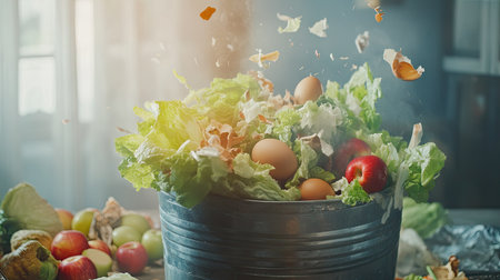 An open trash can showcasing bio trash, including wilted lettuce, apple cores, and eggshells, in a brightly lit room.