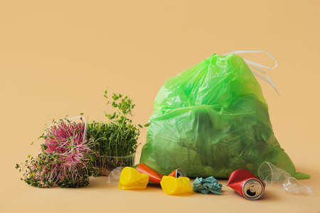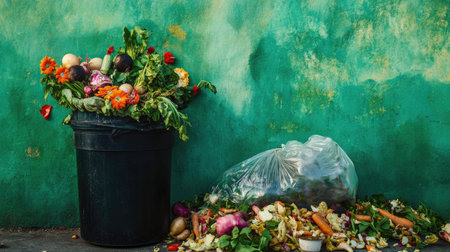 Organic waste container filled with vegetable peelings and a sealed garbage bag placed together, with a vibrant green wall as a backdrop.
