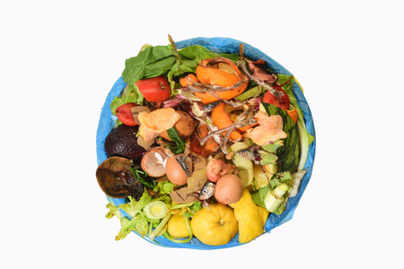 Waste bin with unused food. Food waste as a global problem in the world. Close-up. Concept of wasting and discarding unused food. Top view.