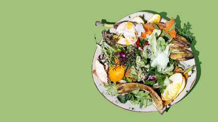 Reducing food waste concept. Leftovers from a meal and blemished fruits and vegetables on plate for for recycling and composting. Zero waste and caring for environment.