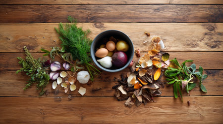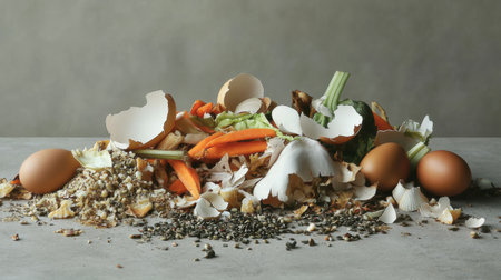 A collection of food scraps, including eggshells, vegetable peels, and seeds, arranged on a gray surface, promoting organic composting and eco-friendly living.