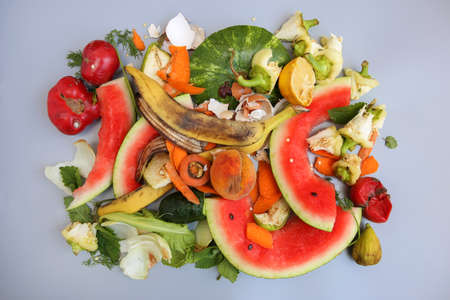 Household waste for composting from fruits and vegetables on a gray background. Top view. Flat lay.