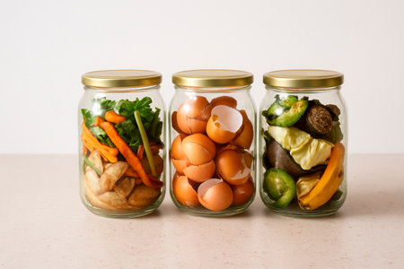 A close-up of organic trash in a bin, including apple cores, potato peels, and eggshells, with a focus on the varied textures of compostable waste.