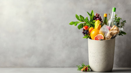 A captivating display of fresh fruits and vegetables arranged in a stylish container against a soft gray backdrop. Perfect for health-focused themes.