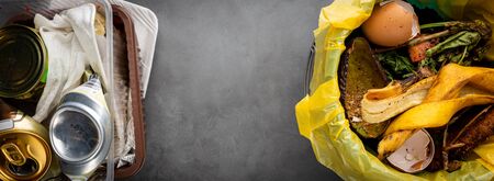 Different trash. Garbage sorting: iron, paper, plastic, domestic waste for compost from fruits and vegetables.