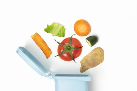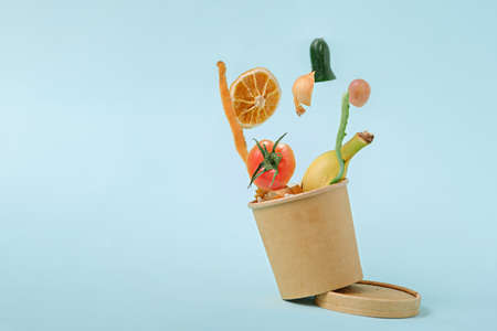 vegetable peels in compost bin with levitation effect on blue background, compost concept, food scarps. Copy space, Sustainable and zero waste