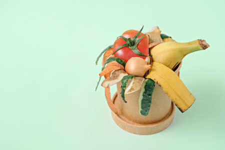 vegetable peels in compost bin on green background, compost concept. Copy space, Sustainable and zero waste, food trash