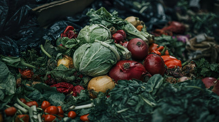 Fresh vegetables including cabbage, onions, and tomatoes are piled together, showcasing vibrant mix of colors and textures. This captures essence of healthy eating and sustainability.