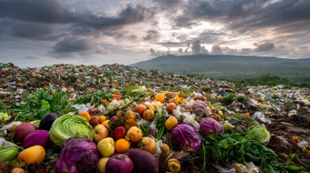 A striking image of a large heap of food waste showcasing discarded fruits and vegetables at a landfill site, emphasizing the critical issue of organic waste disposal.