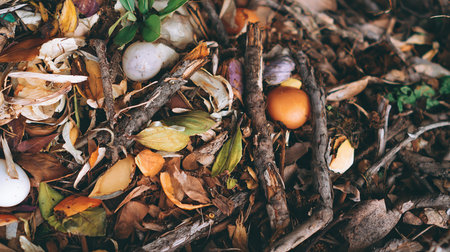 Compost pile, decomposing organic waste, biodegradable waste like vegetables, fruits, eggshell, coffee grounds