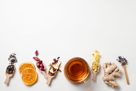 A cup of herbal tea with ginger, dried flowers, fruits and berries on beige background. The concept of healthy eating. Top view and copy space.