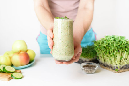 smoothie of micro-green apples cucumber and spinach on a light background. eco organic fresh food detox. ingredients fresh micro-greens. close-up selective focus.