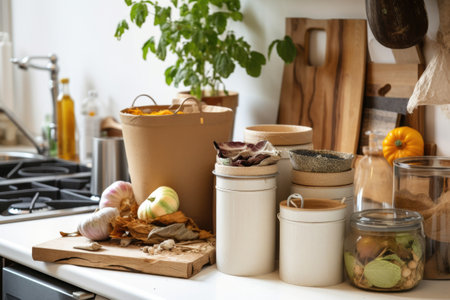 a zero-waste kitchen with a compost bin and jars of spices in view, created with generative ai