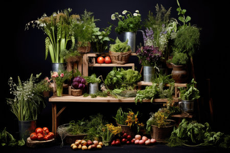 A vibrant array of fresh plants and flowers creatively arranged on a soft green background, perfect for nature themes and wellness concepts.