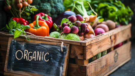The natural beauty and diversity of organic farming, with a wooden crate with the inscription ORGANIC, overflowing with an assortment of freshly picked vegetables
