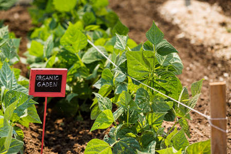 Letter board with text ORGANIC on background of garden bed with green herb parsley. Organic farming, produce local vegetables concept. Supporting local farmers