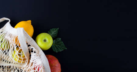 White string bag with fruits on black background. Zero waste shopping concept. Eco friendly lifestyle.