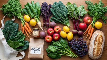 An overhead view showcases an assortment of fresh organic produce. Vibrant green leafy vegetables, red apples, yellow lemons, and purple grapes are artfully arranged. The warm lighting and wooden surface create a rustic setting, suitable for illustrating healthy eating or farm-to-table concepts, and appropriate for commercial use.