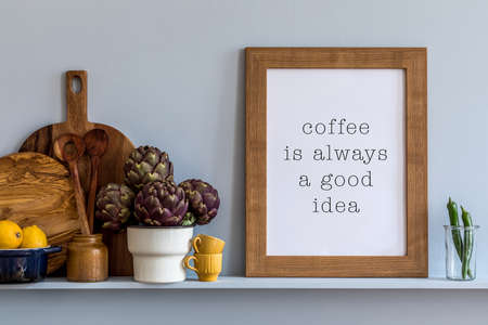 Modern composition on the kitchen interior with mock up photo frame, wooden cutting board, herbs, vegetables and kitchen accessories in stylish home decor.