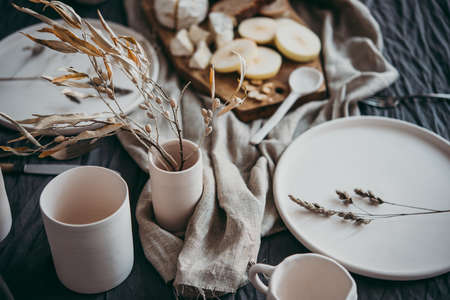 Modern kitchen in minimalistic style furnished with old-fashioned cabinet and tables with healthy food and kitchen utensils