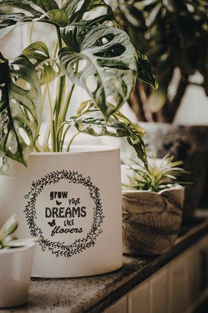 A close-up view of a potted plant with large, glossy leaves in a white pot with an inspirational message, surrounded by other small plants on a wooden surface.