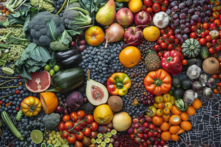 Capture a vibrant, intricate mosaic of assorted fruits and vegetables, arranged in a harmonious blend of colors and textures, suitable for a trendy food blog