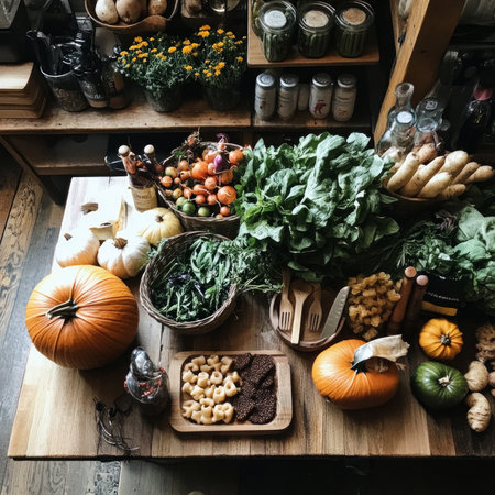 Autumn harvest display with fresh vegetables and pumpkins in rustic kitchen setting.